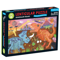 The Dinosaurs Roar! 75 Piece Lenticular Puzzle from Mudpuppy is an exciting and innovative puzzle format that when put together has a wonderful picture that transforms and moves right before your eyes. See dinosaurs transform into their skeletons! Mudpuppy puzzles are packaged in matte-finish sturdy boxes, perfect for gifting, reuse, and storage.